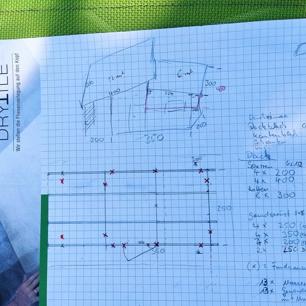 Der Plan für das Gartenhaus wurde kurz auf Papier skizziert und anschließend noch mit Visio erstellt.